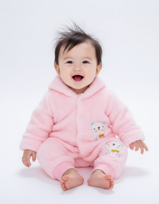 - التصميم: قطعة واحدة بأكمام طويلة وسحاب أمامي لسهولة اللبس، برسمة دب كرتوني على الصدر