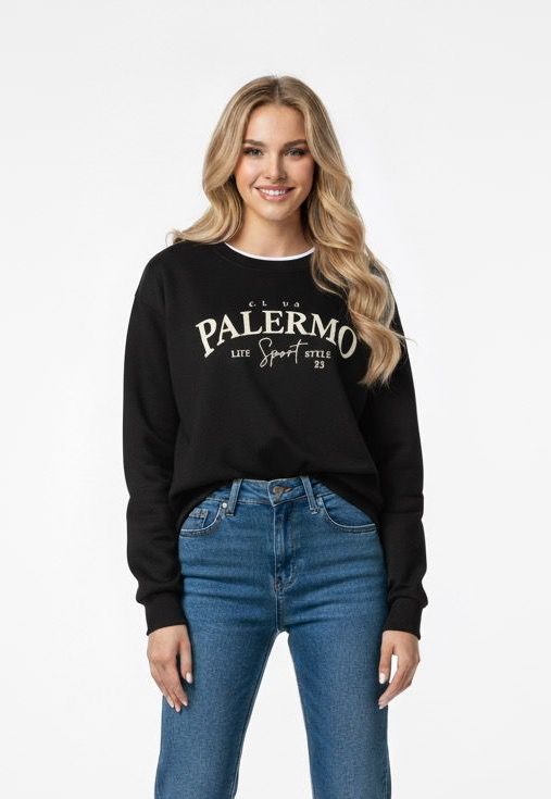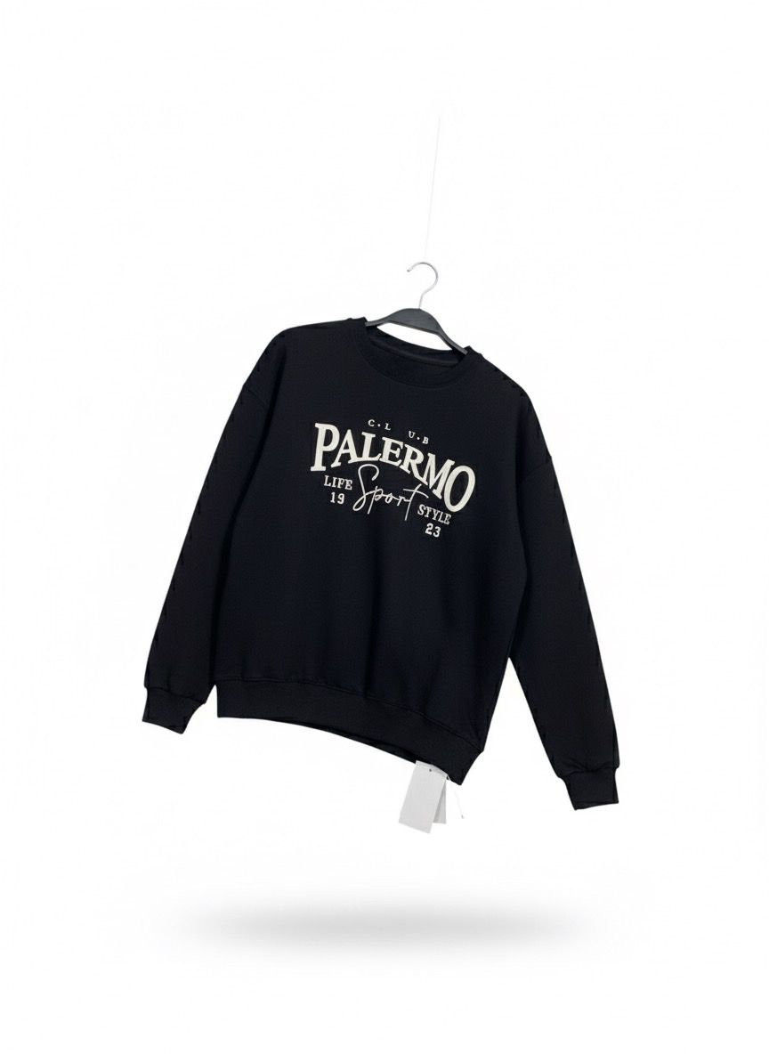 تي شيرت أنيق باللون الأسود مع شعار Palermo المميز في الجهة الأمامية. يتميز بتصميم مريح مع الأكمام الطويلة ونهاية مستديرة. مصمم من قماش عالي الجودة يضمن لك الراحة والدفء طوال اليوم. يضيف لمسة عصرية وأنيقة لمظهرك اليومي.