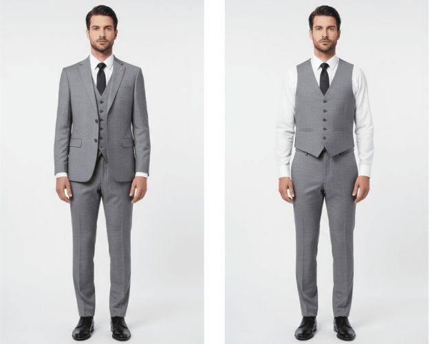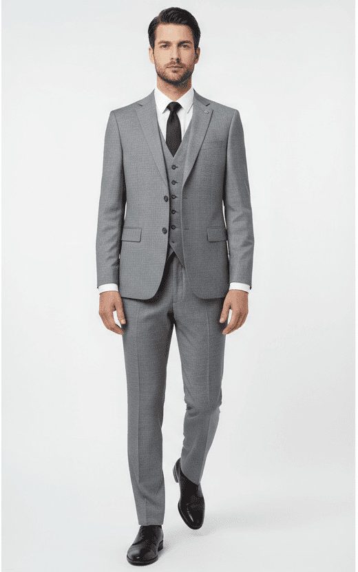 بدلة رسمية للرجال باللون الرمادي مع سترة ثلاثية الأزرار – تصميم عصري وأنيق