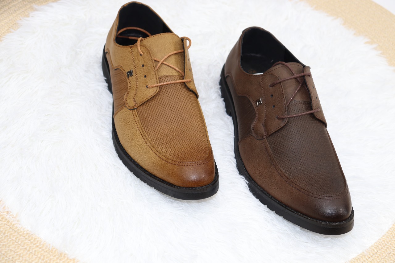 حذاء رجالي رسمي بتصميم أنيق يجمع بين الفخامة والراحة، مصنوع من خامة جلد صناعي مخرم تسمح بتهوية القدم مع الحفاظ على المظهر الكلاسيكي. تصميمه مناسب للإطلالات الرسمية واليومية مع خياطة متقنة تمنح مظهراً راقياً.