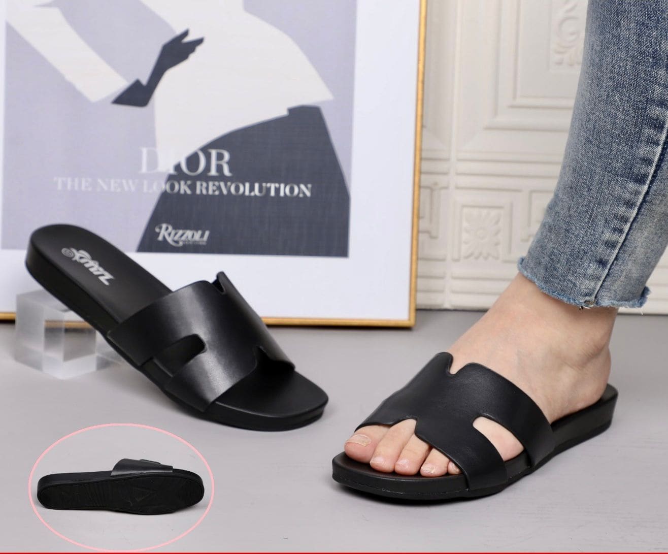 سليبر طبي أنيق بتصميم بسيط ومريح يناسب الاستخدام اليومي. يتميز بلون أسود كلاسيكي وقالب مفتوح من الأمام مع تصميم حرف (H) في الحزام العلوي يمنح القدم مظهراً أنيقاً وعصرياً. الصندل مصنوع من خامة جلد صناعي ناعمة وذات لمعة خفيفة، مع نعل مطاطي مانع للانزلاق لتوفير ثبات أثناء المشي.