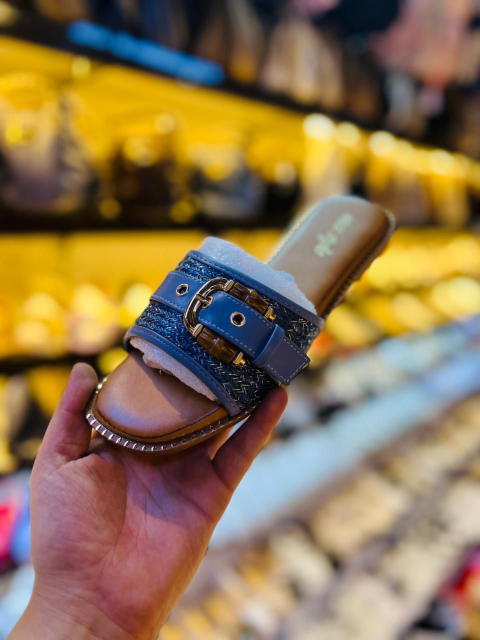اللون: الحذاء يتميز بلون بني دافئ مع تفاصيل باللون الأزرق الداكن على الحزام.