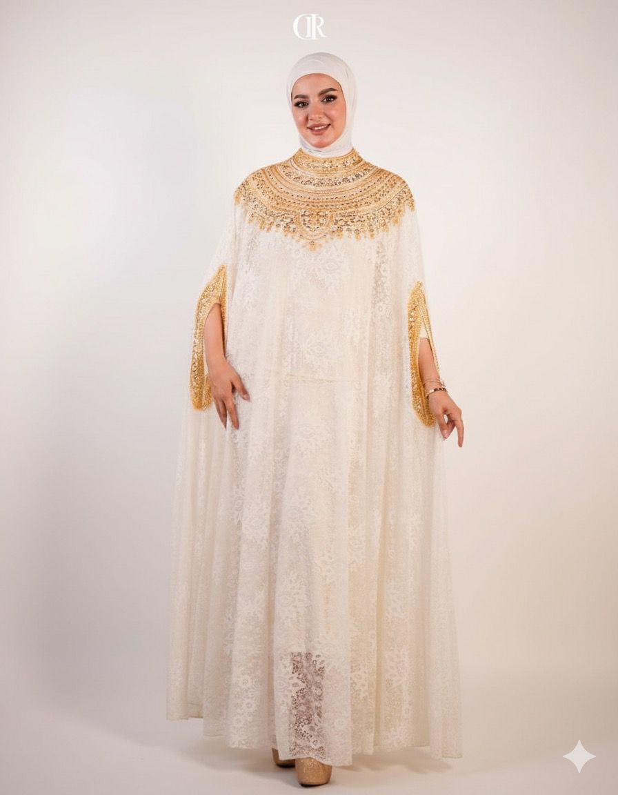 تطريز لامع حول الرقبة والأطراف بتصميم ملكي فخم.
