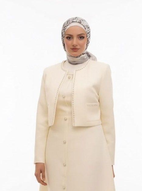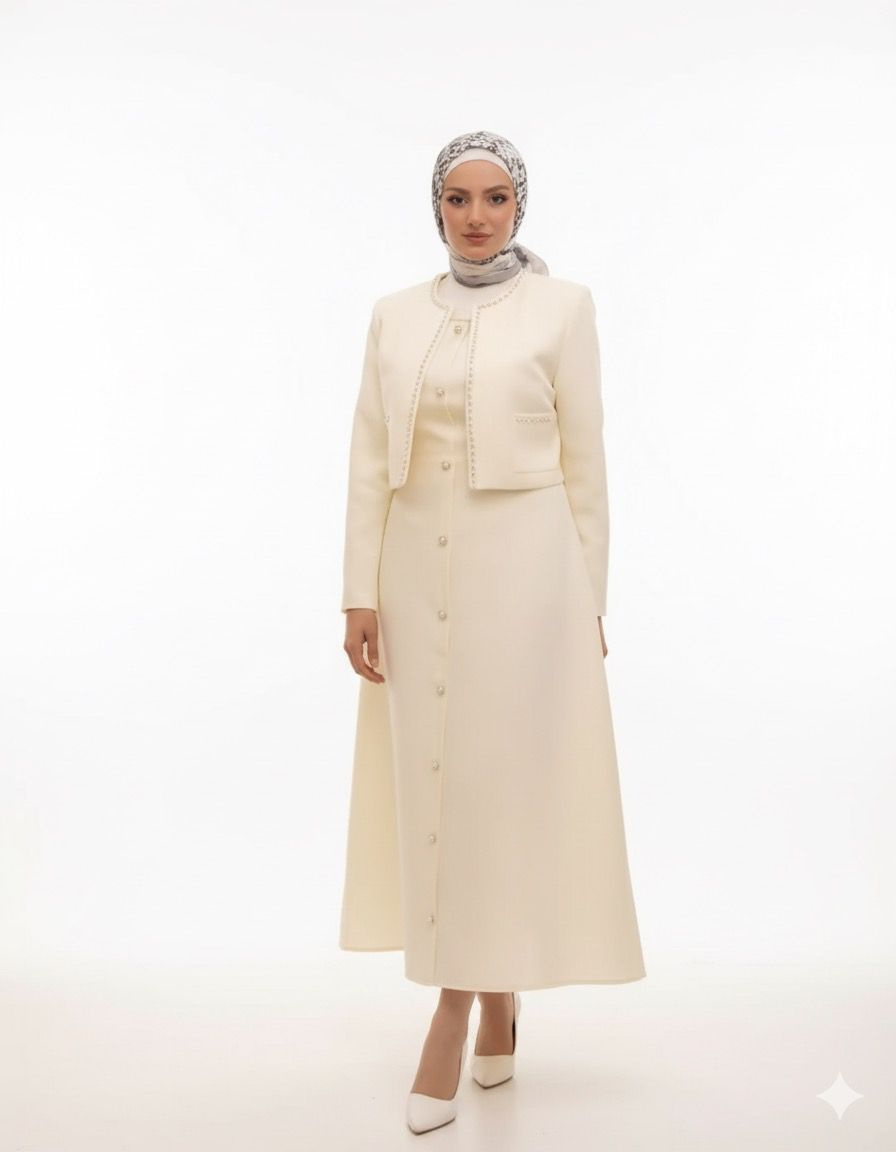 فستان نسائي أنيق بتصميم محتشم وراقي يناسب الإطلالات الرسمية والمناسبات الراقية. يتميز الفستان بقصة انسيابية بأزرار أمامية تمتد على الطول الكامل، مع جاكيت قصير بنفس القماش مزين بتفاصيل دقيقة على الأطراف تضفي لمسة فخمة وبسيطة في الوقت نفسه. الخامة فاخرة وناعمة تمنحك راحة وأناقة تدومان طوال اليوم.