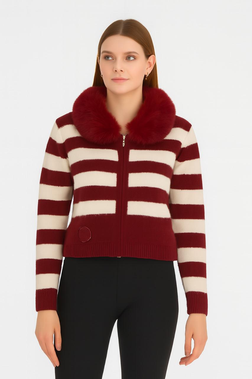كنزة نسائية مخططة بياقة فرو ناعمة بتصميم أنيق ودافئ
