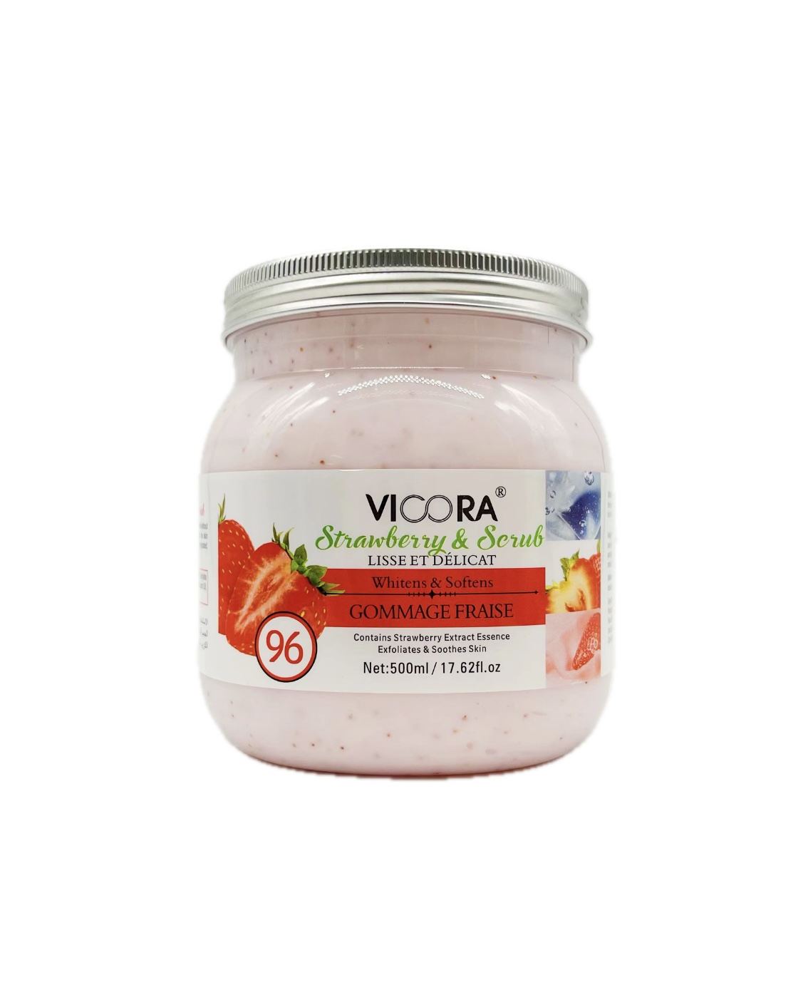 **تعليمات استخدام مقشر البشرة بالفراولة من VICORA** 1. **بللي بشرتك:** ابدئي بغسل المنطقة المراد تقشيرها (الجسم أو اليدين أو القدمين) بماء دافئ لفتح المسام وتحضير البشرة. 2. **ضعي كمية مناسبة:** خذي كمية مناسبة من مقشر الفراولة باستخدام يديك النظيفة. 3. **دلكي بلطف:** وزعي المقشر على البشرة ودلكي بحركات دائرية ناعمة لمدة 2-3 دقائق، مع التركيز على المناطق الخشنة أو الجافة. تجنبي ملامسة المقشر للوجه أو المناطق الحساسة. 4. **اشطفي جيداً:** اغسلي بشرتك بالماء الفاتر جيداً حتى تتخلصي من بقايا المقشر تماماً. 5. **رطبي البشرة:** بعد التجفيف، يُنصح باستخدام مرطب الجسم للحفاظ على نعومة البشرة. **تكرار الاستخدام:** استخدمي المقشر من 1 إلى 2 مرات أسبوعياً فقط، ولا تفرطي في الاستخدام لتجنب تهيج البشرة.