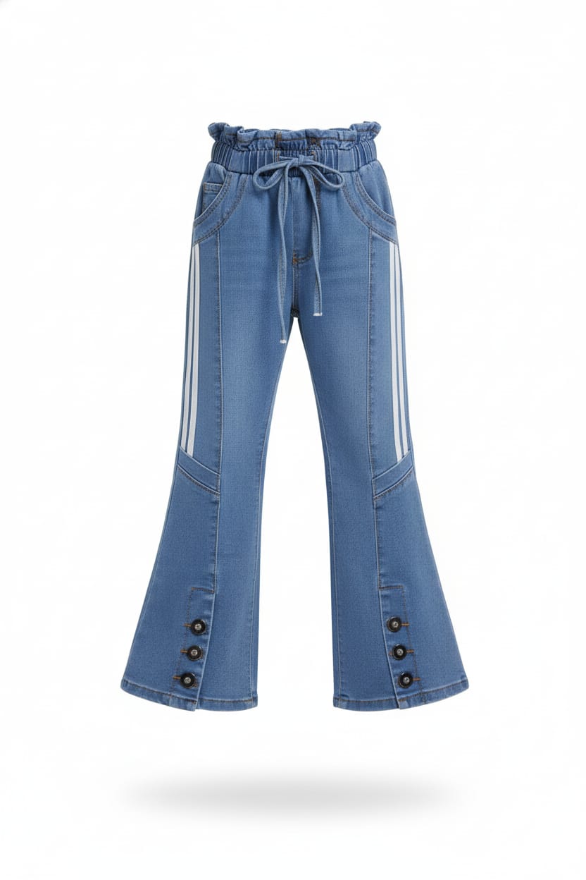 امنحي طفلتك إطلالة أنيقة وعملية مع هذا البنطال الجينز المصمم بأسلوب يجمع بين الراحة والموضة. يتميز بقصة خصر مرتفع مع حزام مطاطي ورباط قابل للتعديل، مما يوفر ملاءمة مثالية وسهولة في الارتداء. الخطوط البيضاء العمودية على الجانبين تضفي لمسة رياضية عصرية، بينما تضيف الأزرار الزخرفية عند الحافة السفلية للأرجل لمسة أنثوية جذابة.