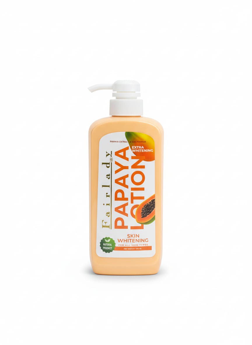 لوشن Fairlady بتركيبة مستخلصة من البابايا وفيتامين B3 هو خيار مثالي لمن تبحث عن بشرة أكثر إشراقًا ونعومة. تركيبته الغنية بالفواكه تُساعد على توحيد لون البشرة، تغذيتها، وترطيبها بعمق، مع الحفاظ على ملمسها الحريري. تصميمه الحيوي مع صور البابايا يُعكس فعاليته الطبيعية والمنعشة.
